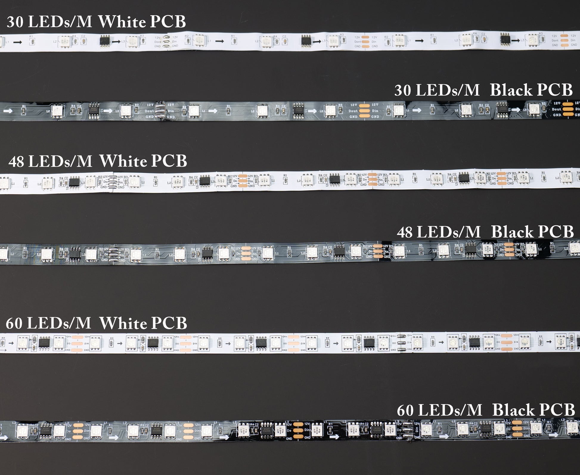 | LED Density & Matching | - 30 LEDs/M (10 ICs/M, 9W/M) - 48 LEDs/M (16 ICs/M, 14.4W/M) - 60 LEDs/M (20 ICs/M, 18W/M) - 96 LEDs/M (32 ICs/M, 28.8W/M) |